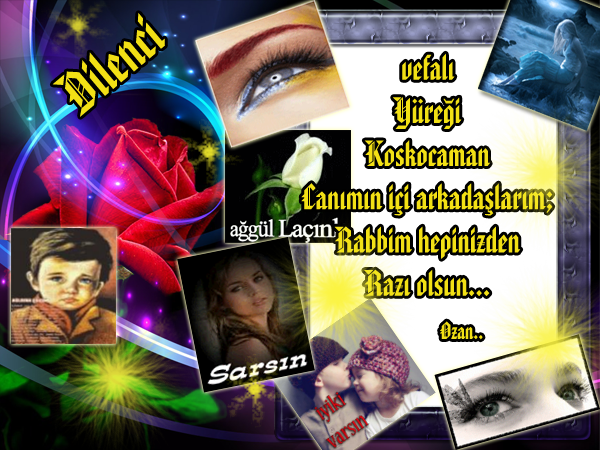 Canımın içi arkadaşlarım; Alemlerin Rabbi Güzel Allah'ımın ne özel kulları olduğunuzu siz zaten biliyorsunuz. Ben bu sıcak dostluğunuz karşısında ancak Rabbime sizden razı olmasını;sevdiklerinze ve size sağlık ve afiyet nasib etmesini,ahirete intikal etmişlere Rahmet eylemesine Peygamberimizin şefaatinden nasiblenmesi için en halishane hislerimle dua etmekle yetineceğim..Yüreği,kendi güzel ve özel dostlarım kelimelerin kifayet etmediği duygularımı yine o en harika izan ve anlayışınıza havale ediyorum..Güzel Allah'ım neyi dua ediyorsanız kabul eylesin..